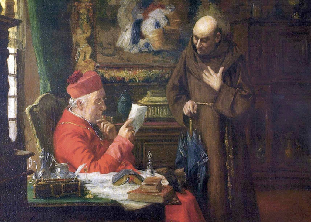 CON el índice en la barbilla, en actitud reflexiva, un cardenal romano lee con atención la misiva que le ha traído un fraile franciscano. Aguarda éste en pie, respetuosamente. Apoyado en un colorido paraguas azul, y con la cabeza un poco inclinada hacia delante y el gesto sincero de su mano izquierda, que se lleva al pecho, de sus labios entreabiertos afloran algunas palabras que aportan detalles de interés.
