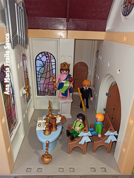 “La última figura colocada en la maqueta y que tiene un lugar especial ha sido la de María Auxiliadora que ha sido readaptada a partir de una figura de una diosa romana de las colecciones de Playmobil”, relata Rubén Sanz. “Además se ha confeccionado con los mismos colores que la imagen que se encuentra en la basílica de Turín, construida por el propio Don Bosco y que visitó el papa Francisco”.