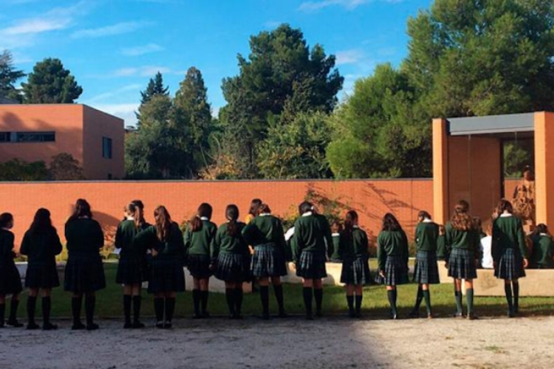 Las niñas de Los Tilos están rezando, al ser lunes, los misterios gozosos. Lo hacen por turnos ante una imagen de la Virgen situada en una ermita en el patio. «Participan desde Infantil hasta Bachillerato, cada una a su nivel: las pequeñitas, un misterio; y ya desde 3º de Primaria, las niñas que hacen la Primera Comunión este año, rezarán el rosario entero». Además, lo van ofreciendo por «la paz en el mundo, por algún país especial…».
