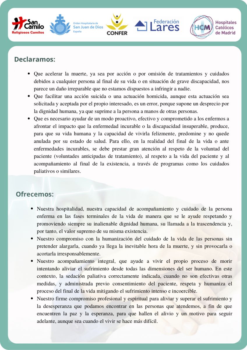 El delegado general de los religiosos camilos, José Carlos Bermejo, promueve la adhesión al manifiesto, “tememos que la ley de la eutanasia desmotive a personas que necesitan cuidados para vivir dignamente y con sentido; que intereses espurios generen demanda de ayuda o ejecución de eutanasia; que disminuya el compromiso social por salir al paso de la soledad no deseada y de los cuidados dignos en la dependencia, así como prácticas indiscriminadas de sedación no correcta. En definitiva, tememos una cultura del descarte en torno al sufrimiento y el morir”.