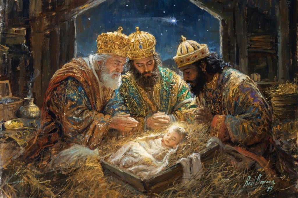 Al ver la estrella, se llenaron de inmensa alegría. Entraron en la casa, vieron al niño con María, su madre, y cayendo de rodillas lo adoraron; después, abriendo sus cofres, le ofrecieron regalos: oro, incienso y mirra.
